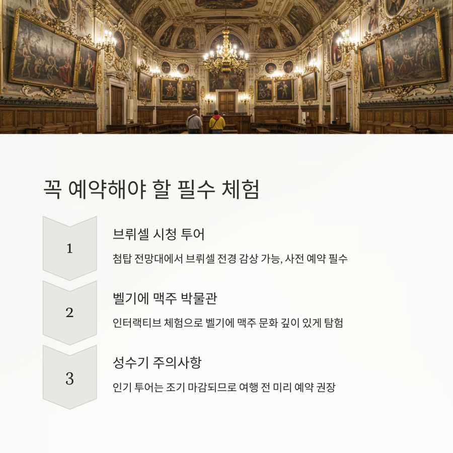 브뤼셀 시청 투어는 가이드와 함께 내부를 둘러볼 수 있는 특별한 기회예요. 화려한 고딕 양식의 내부와 역사적 가치가 높은 유물들을 볼 수 있답니다.
