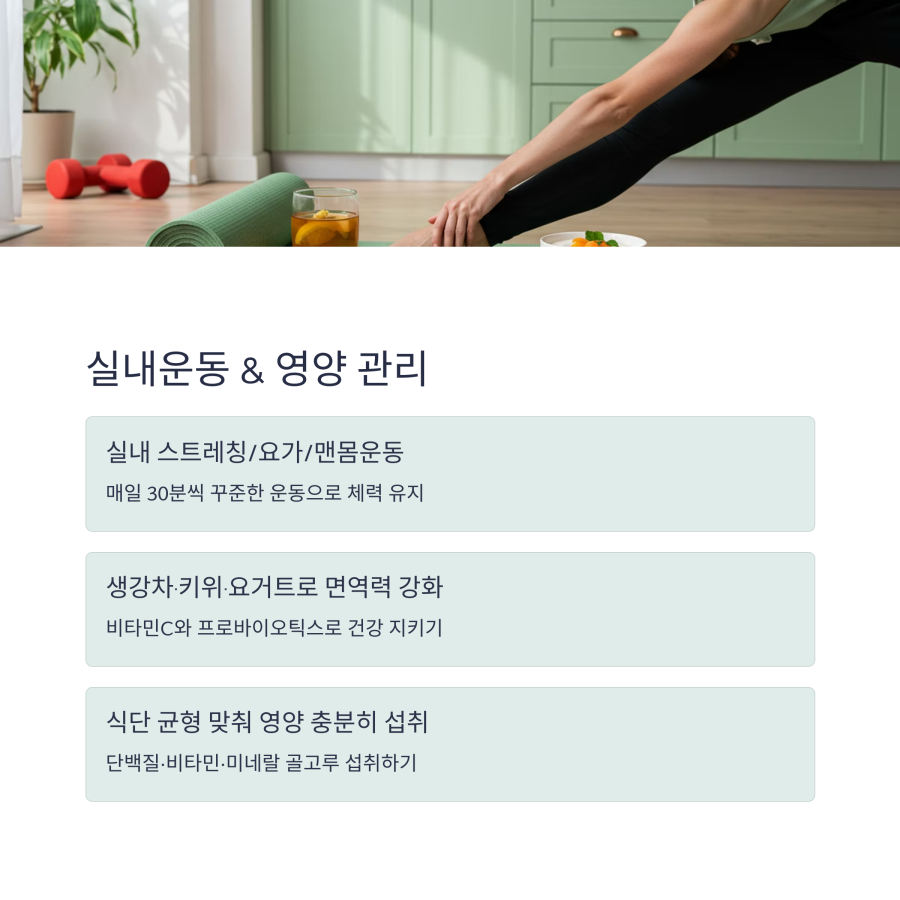 습도 관리, 실내 운동, 영양 섭취, 마음 관리 이 네 가지만 잘 챙겨도 건강한 장마철을 보낼 수 있습니다.