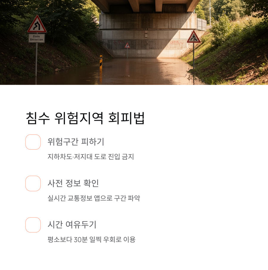 실시간 교통정보 앱을 활용하면 침수 위험 구간을 미리 알 수 있어요.