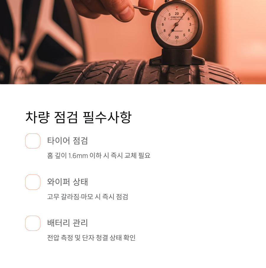 | Q: 장마철 타이어 교체 시기는 언제인가요? | 타이어 홈이 1.6mm 이하이거나 균열이 보이면 즉시 교체하세요. |