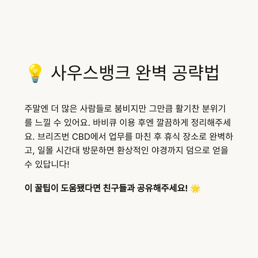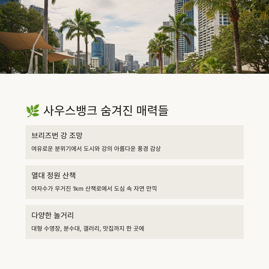 안녕하세요! 오늘은 호주 브리즈번의 아름다운 도심 속 오아시스, 사우스뱅크에 대한 정보를 공유해 드리려고 해요. 😊
